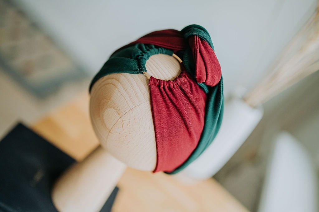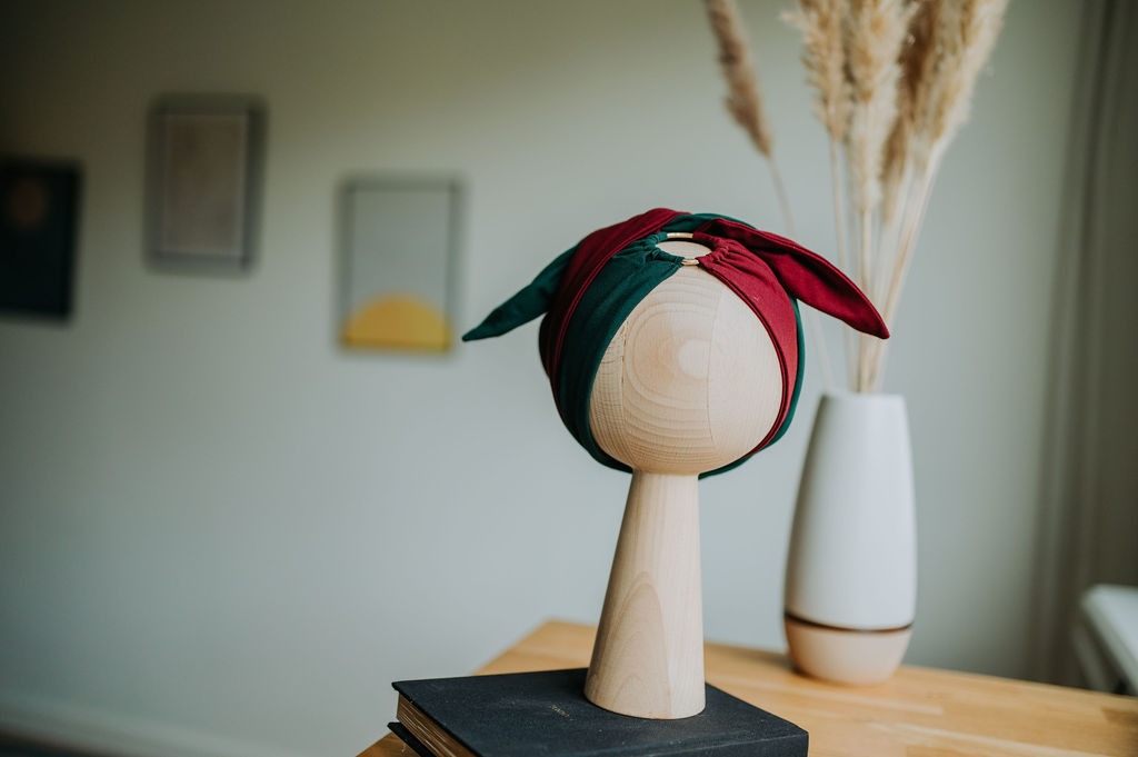 Dwukolorowa opaska połączona lekkim, metalowym kółkiem, wykonana z wyjątkowo miękkiej i przyjemnej w dotyku dzianiny typu tencel.